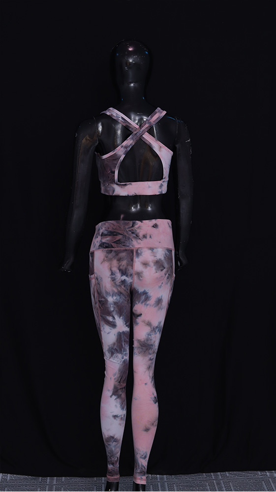 The matching pattern across the leggings and bra creates a complete and attractive outfit.